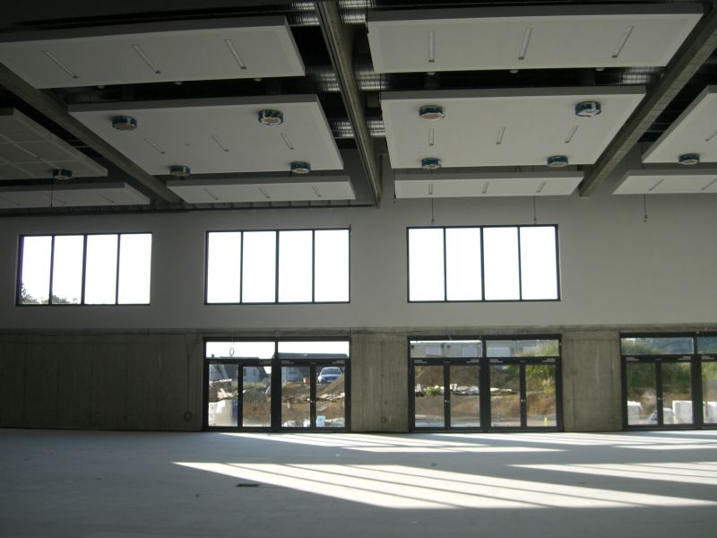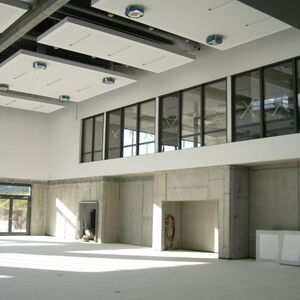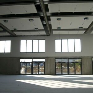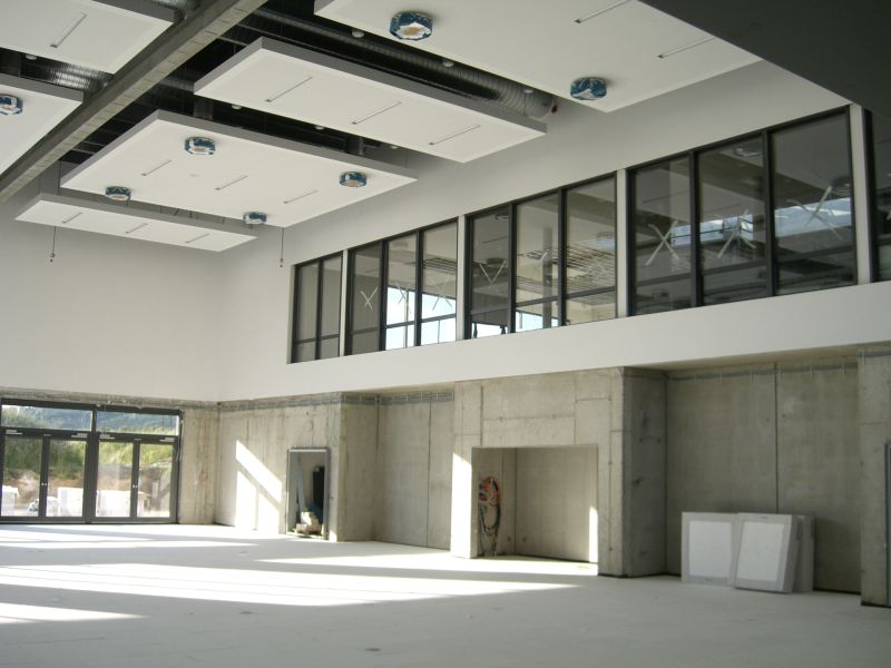 Dimension: Mehrzweckhalle: 40,00 x 40,00 m | Foyer, Eingang: 38,00 x 22,00 m Kellergeschoss: 38,00 x 22,00 m + 18,00 x 18,50 m