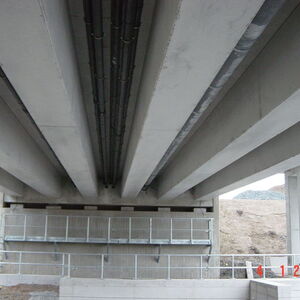 Unter der Brücke sind Leerrohre angehangen, die im Bereich der Widerlager die Stahlbetonkonstruktion durchdringen.